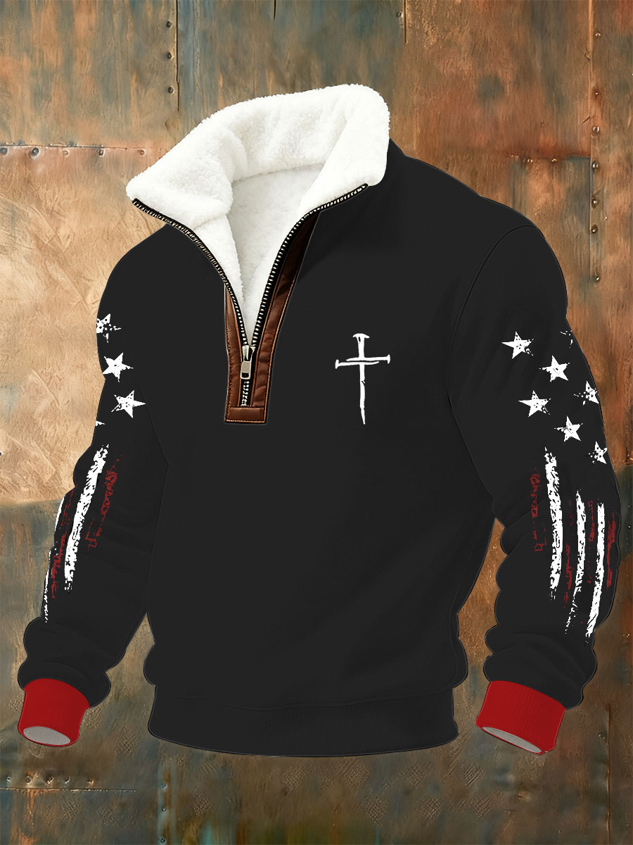 Men's Faith Cross Print Plush Stand Collar Shirt